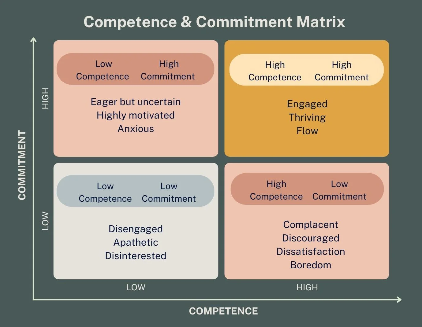 In workplace psychology, engagement can also be viewed through the Competence and Commitment Matrix — a simple model that maps where tasks fall based on the individual’s competence (skill) and commitment (motivation) to the task.